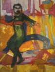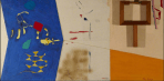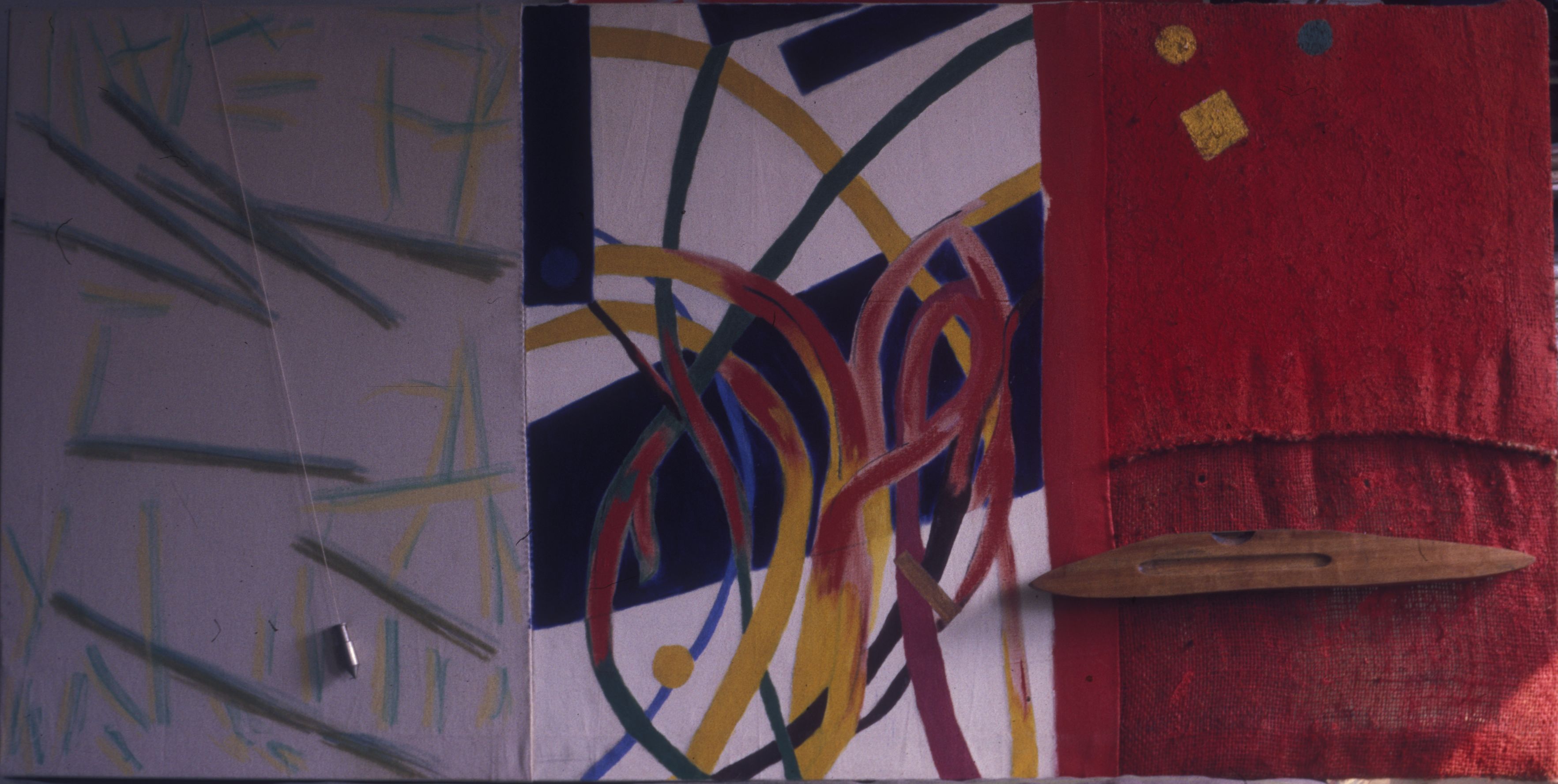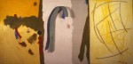 (oil on two canvas panels hinged, with sculptured wood form in centre)